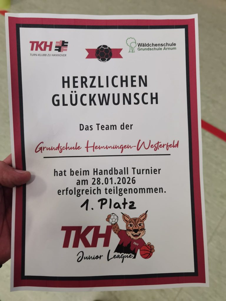 Die Handball AG des Ganztages durfte beim Junior League Turnier des TKH mitmachen. Unsere Grundschule setzte sich gegen Arnum und Hiddestorf durch und belegte am Ende den 1. Platz. Herzlichen Glückwunsch an das Team!